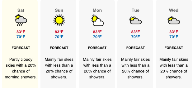 Temperature: Today’s expected temperatures – 73°F to 87°F. Yesterday: H 86.8°F L 68.5°F