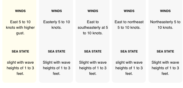 Winds: Today E 10-15 mph Tonight: E 5-10 mph