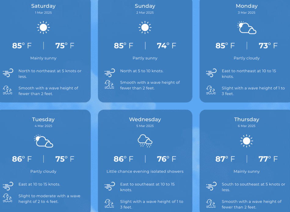 Expected temperatures: 76°F to 85°F. Yesterday: H 83.5°F L 73.5°F