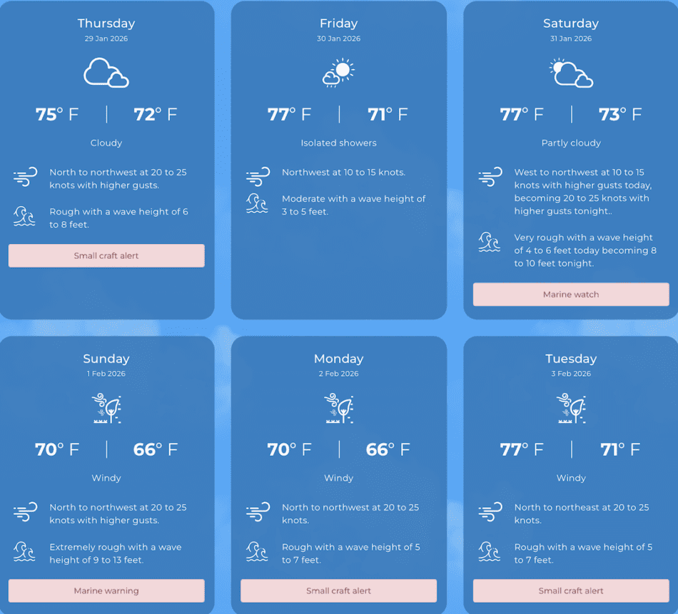 Sea: Rough with a wave height of 5 to 7 feet. Small craft advisory.