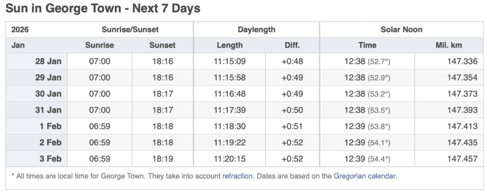 IMPORTANT NOTICEThe times reflected in the tidal table for Grand Cayman are predictions valid as references for sports fishing in areas near the coast of Grand Cayman. THEY ARE NOT SUITABLE FOR NAVIGATION. Remember that to practice any activity at sea like diving, windsurfing and fishing from a boat or underwater fishing should always be consulted with the official tidetables of the port of Grand Cayman.