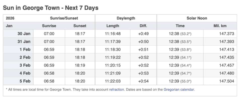 IMPORTANT NOTICEThe times reflected in the tidal table for Grand Cayman are predictions valid as references for sports fishing in areas near the coast of Grand Cayman. THEY ARE NOT SUITABLE FOR NAVIGATION. Remember that to practice any activity at sea like diving, windsurfing and fishing from a boat or underwater fishing should always be consulted with the official tidetables of the port of Grand Cayman.
