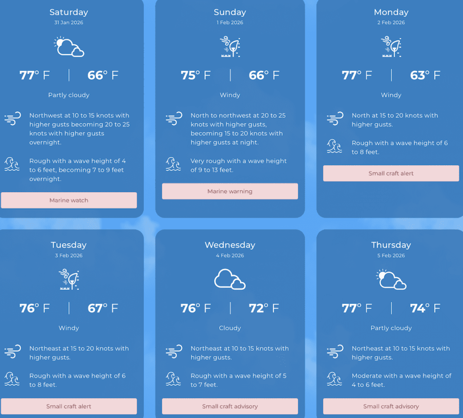 Expected temperatures: 69o F to 78o  F. Yesterday: H 80.4.°F  L 74.1°F