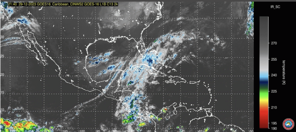 Cloudy rainy conditions are expected over the Cayman area for the next 24 hours as a cold front moves just east of our area this morning. Further north, a reinforcing cold front over western Cuba is expected to move into the Cayman area this evening supporting additional showers along with fresh to strong winds and rough seas. The satellite images show multi-layered clouds spreading into the Cayman area.