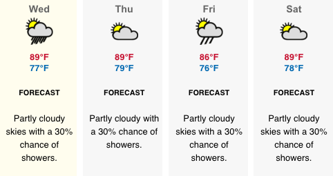 Temperature: Today’s expected temperatures – 80° to 94°F. Yesterday: H 93.6°F L 80.1°F