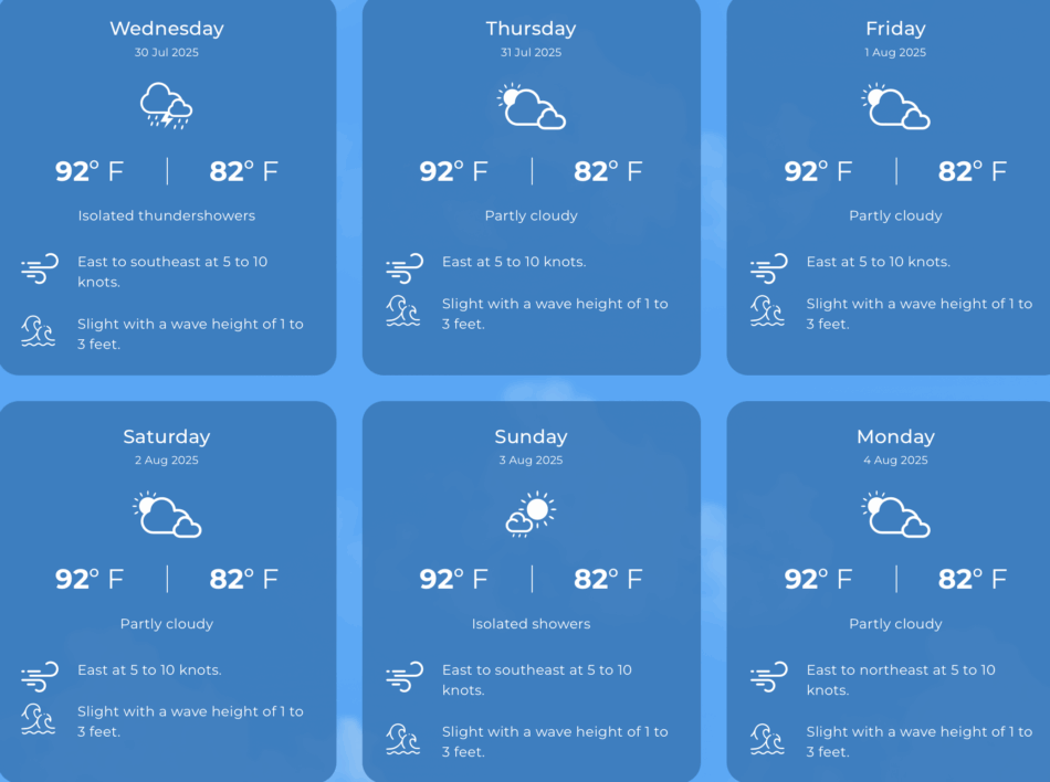 Expected temperatures: 80°F to 90°F. Yesterday: H 92.5°F L 82.1°F