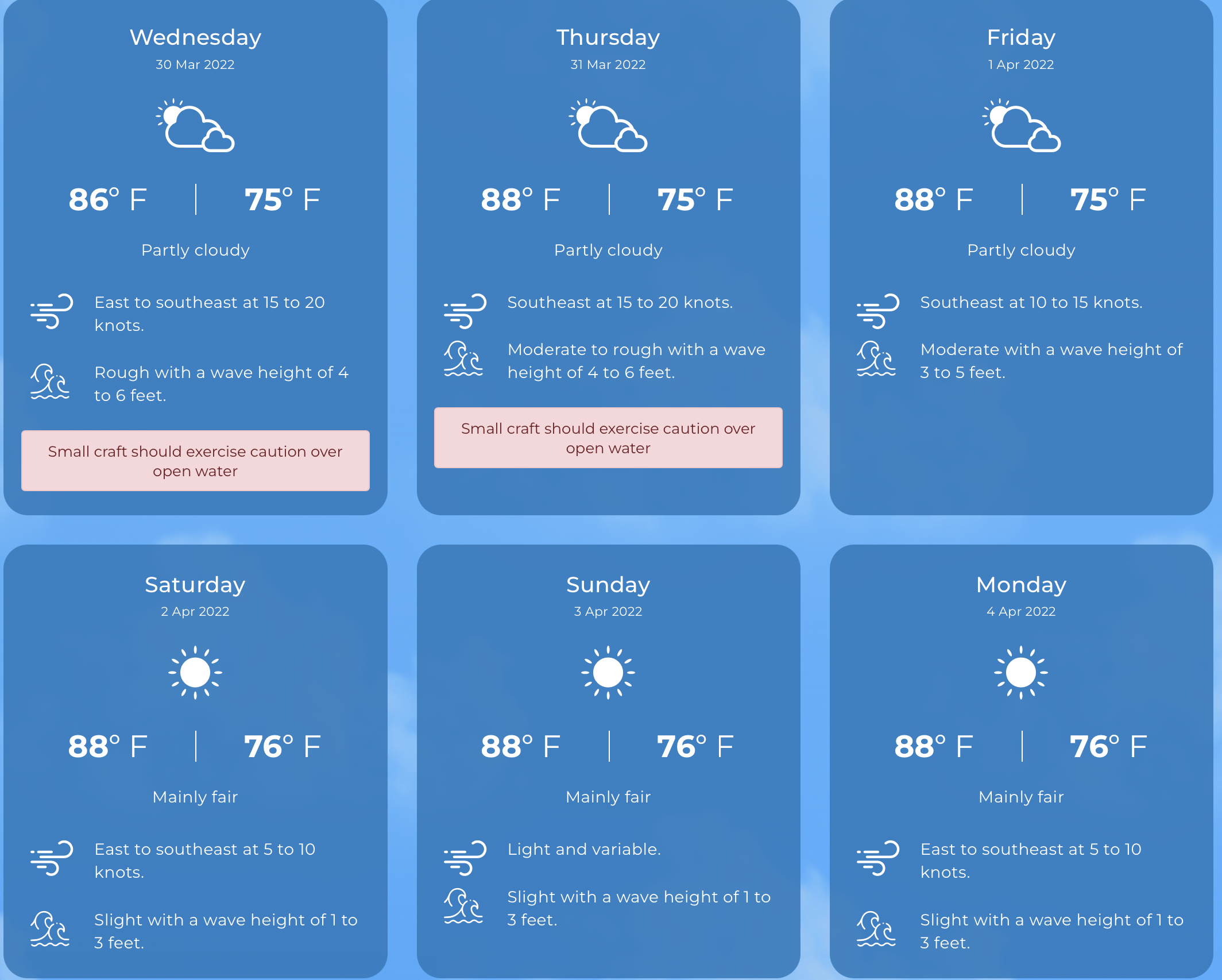 UV: 5 Moderate (DOWN from yesterday) Expected temperatures: 76°F to 86°F. Yesterday: H 83.6°F L 74.9°F