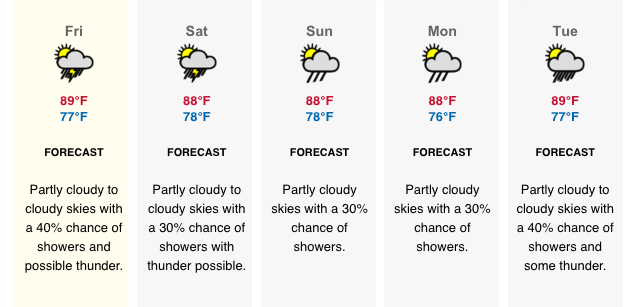 Temperature: Today’s expected temperatures – 79°F to 91°F. Yesterday: H 90.6°F L 78.3°F
