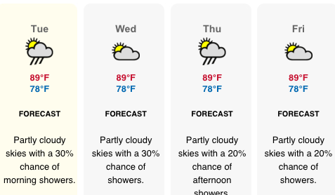 Temperature: Today’s expected temperatures – 81°F to 89°F. Yesterday: H 90.0°F L 81.4°F