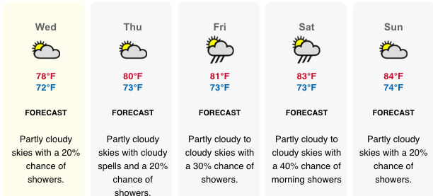 Temperature: Today’s expected temperatures – 70°F to 80°F. Yesterday: H 78.5°F L 71.7°F