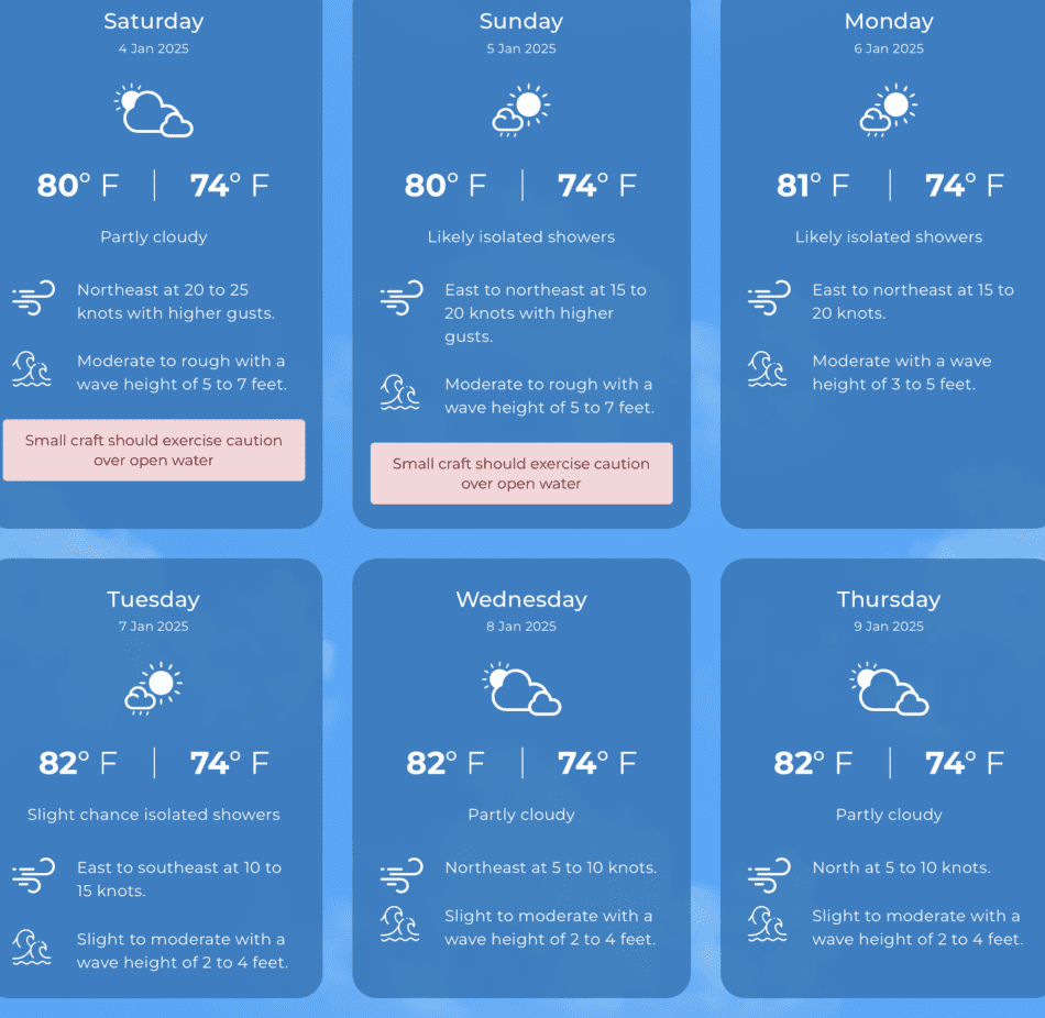 Sea: Moderate to rough with a wave height of 5 to 7 feet. Small craft should exercise caution over open water.