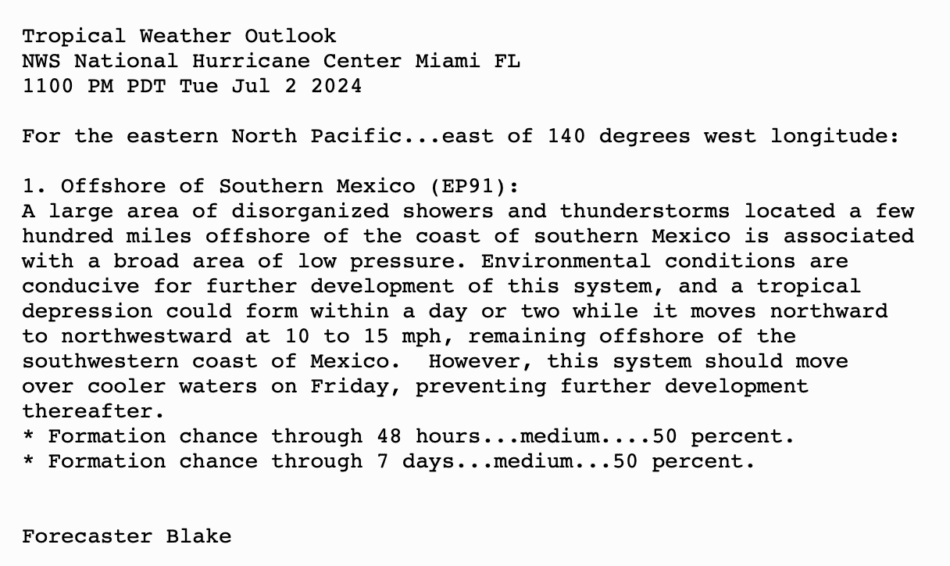 | Tropical Weather Outlook 500 AM PDT Wed 3 July 2024 Tropical Weather Discussion 1005 UTC Wed 3 July 2024 | |