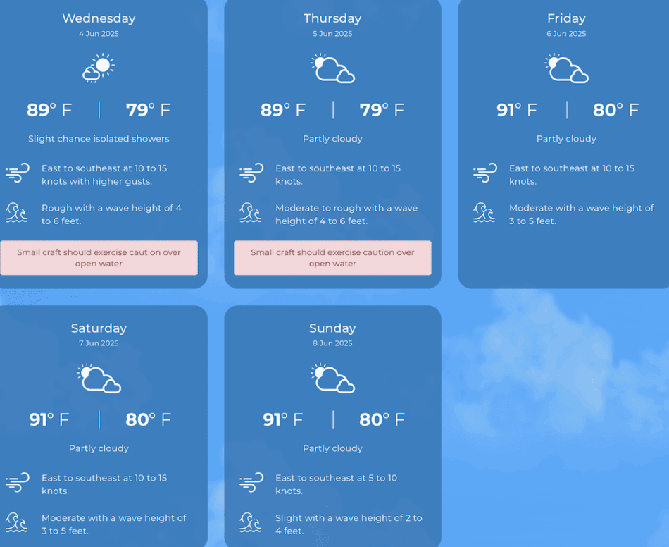 Expected temperatures: 79°F to 89°F. Yesterday: H 89.3°F  L 79.1°F