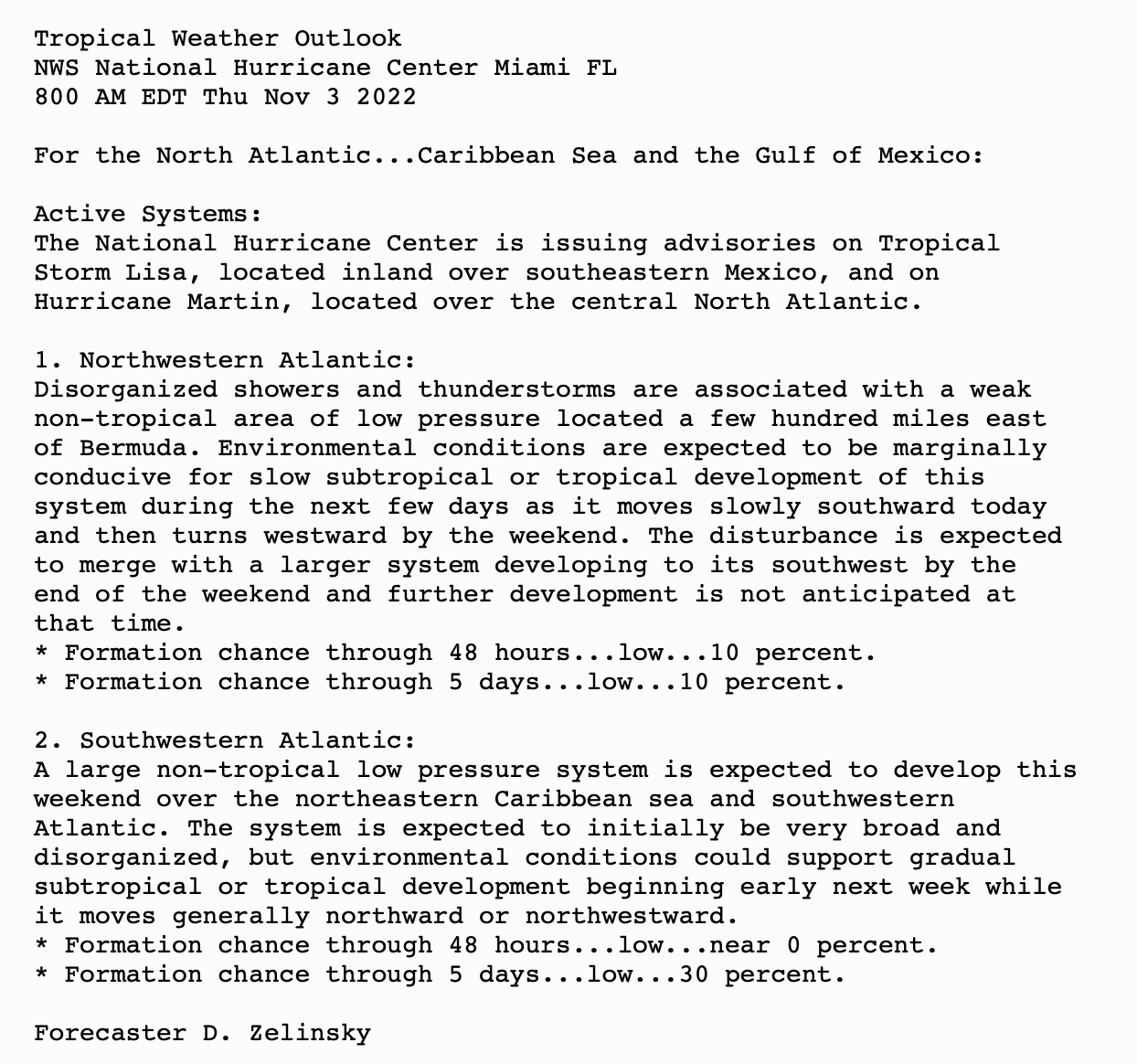 | Tropical Weather Outlook (en Español*) 800 AM EDT Thu Nov 3 2022 1205 UTC Thu Nov 3 2022 | |