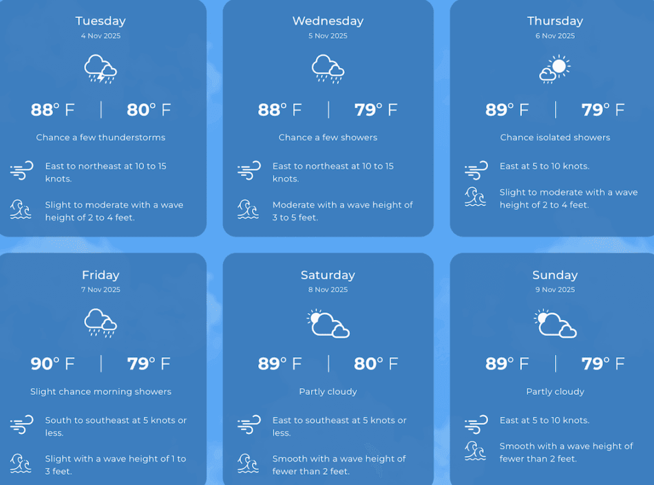Expected temperatures: 79°F to 89°F. Yesterday: H 87.9°F L 79.2°F