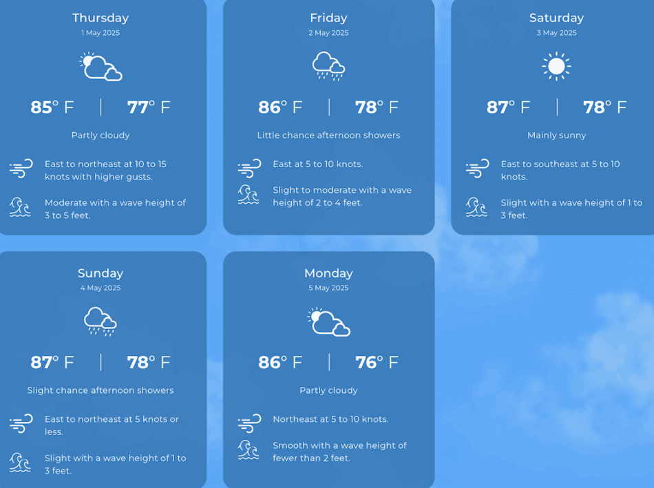 Expected temperatures: 77°F to 85°F. Yesterday: H 85.2°F L 77.4°F
