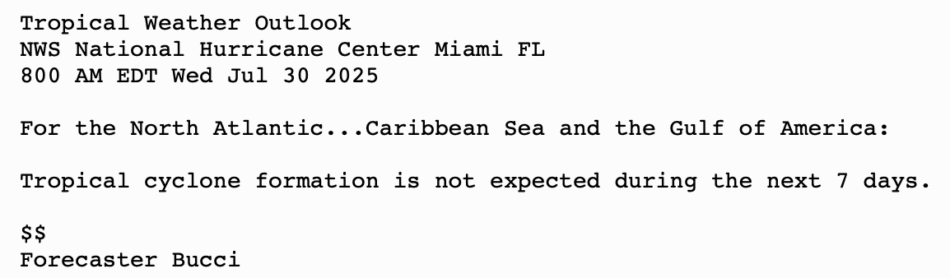 | Tropical Weather Outlook 800 AM EDT Wed 30 July 2025 1205 UTC Wed 30 July 2025 | |