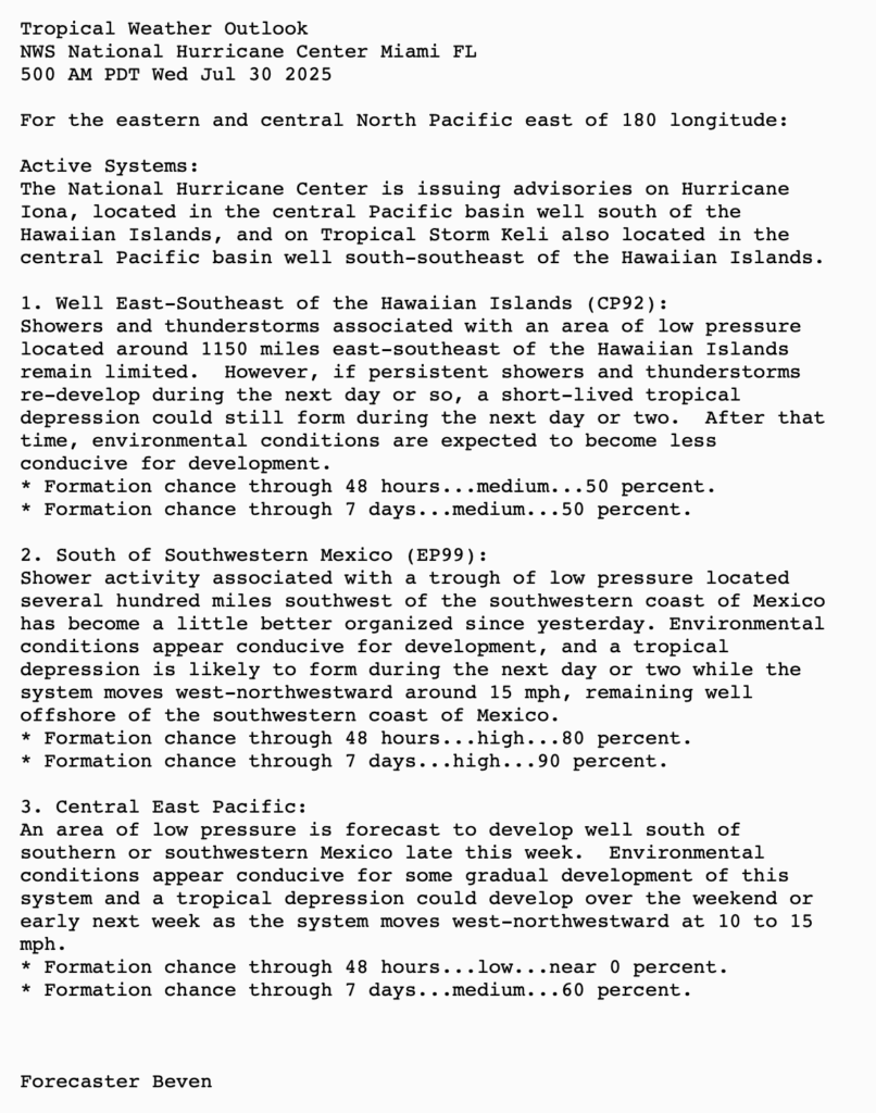 | Tropical Weather Outlook 500 AM PDT Wed 30 July 2025 1005 UTC Wed 30 July 2025 | |