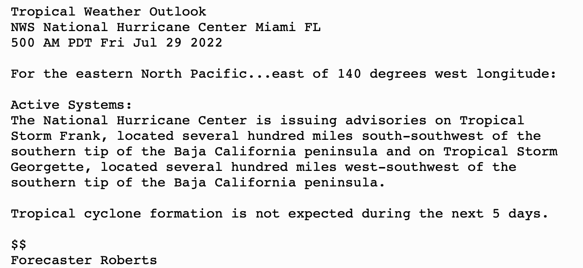 | Tropical Weather Outlook 500 AM PDT Sat July 30 2022 Tropical Weather Discussion 1005 UTC Sat July 30 2022 | |