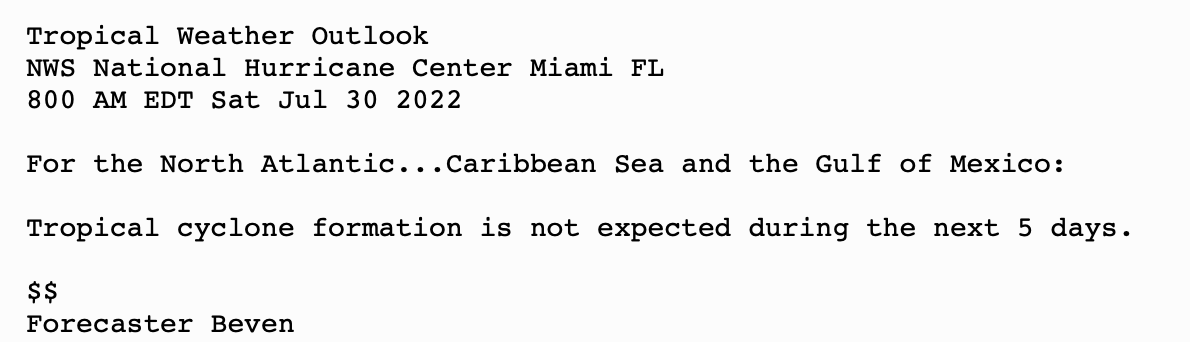 | Tropical Weather Outlook (en Español*) 800 AM EDT Sat July 30 2022 1205 UTC Sat July 30 2022 | |