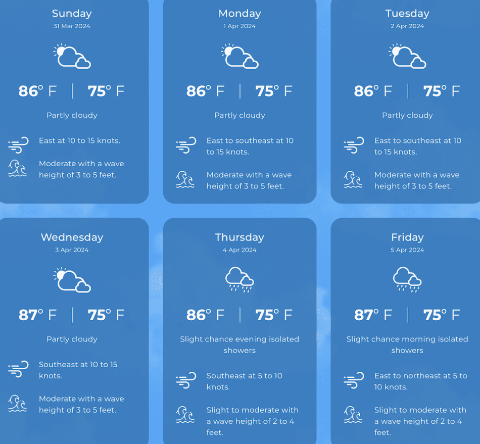 IMPORTANT NOTICEThe times reflected in the tidal table for Grand Cayman are predictions valid as references for sports fishing in areas near the coast of Grand Cayman. THEY ARE NOT SUITABLE FOR NAVIGATION. Remember that to practice any activity at sea like diving, windsurfing and fishing from a boat or underwater fishing should always be consulted with the official tide tables of the port of Grand Cayman.