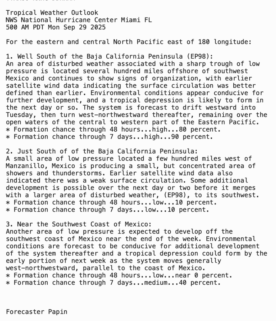 | Tropical Weather Outlook 500 AM PDT Tue 30 Sep 2025 1005 UTC Tue 30 Sep 2025 | |