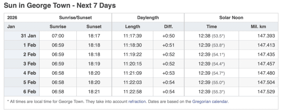 Grand Cayman Sun & Tides Tables January 2026