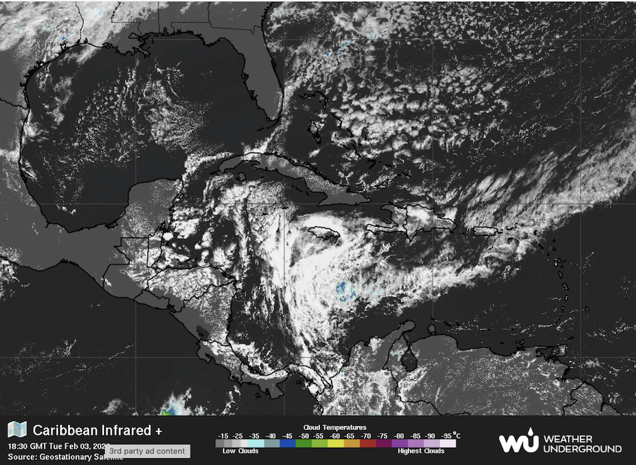 Cloudy skies with intermittent rain and occasional showers are expected through the next 36 hours as increasing moistures drifts over the western Caribbean, trailing the remnants of a frontal boundary. Some of these showers may become locally heavy at times, especially overnight. From late-Thursday, a less impactful front than our previous will drift across the northwest Caribbean, decreasing showery activity and bringing fresh to strong winds, rough seas and noticeably cooler temperatures.