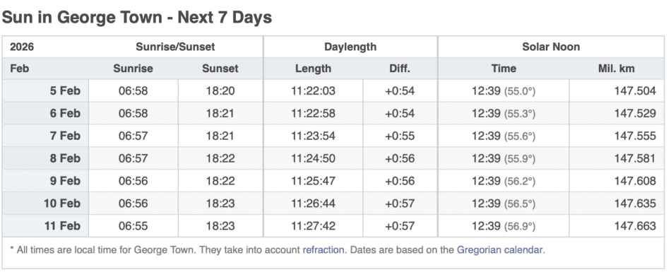 Grand Cayman Sun & Tides Tables February 2026