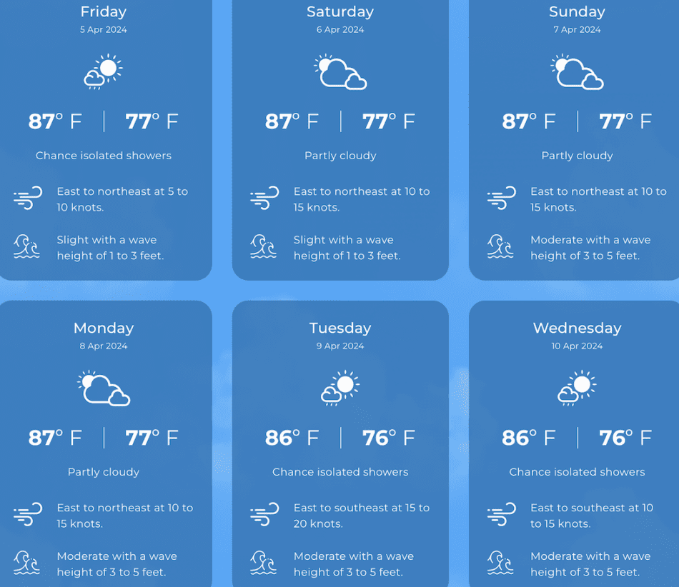 Expected temperatures: 77°F to 87°F. Yesterday: H 87.4°F L 77.4.°F