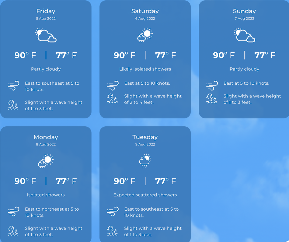 IMPORTANT NOTICEThe times reflected in the tidal table for Grand Cayman are predictions valid as references for sports fishing in areas near the coast of Grand Cayman. THEY ARE NOT SUITABLE FOR NAVIGATION. Remember that to practice any activity at sea like diving, windsurfing and fishing from a boat or underwater fishing should always be consulted with the official tide tables of the port of Grand Cayman.