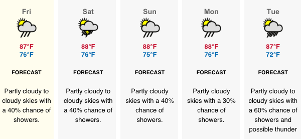 Temperature: Today’s expected temperatures – 76°F to 84°F. Yesterday: H 83.5°F L 77.0°F