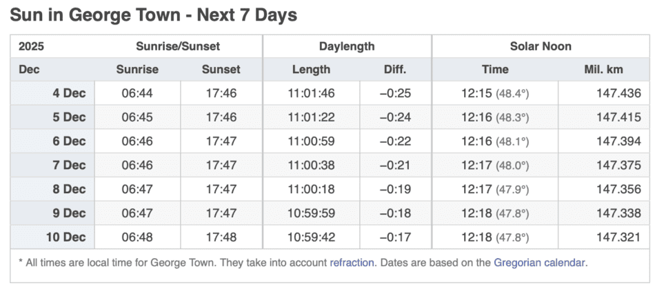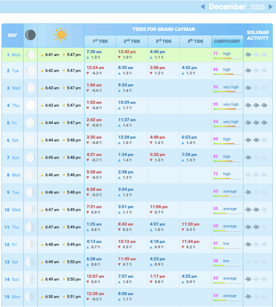 Grand Cayman Sun & Tides Tables December 2025