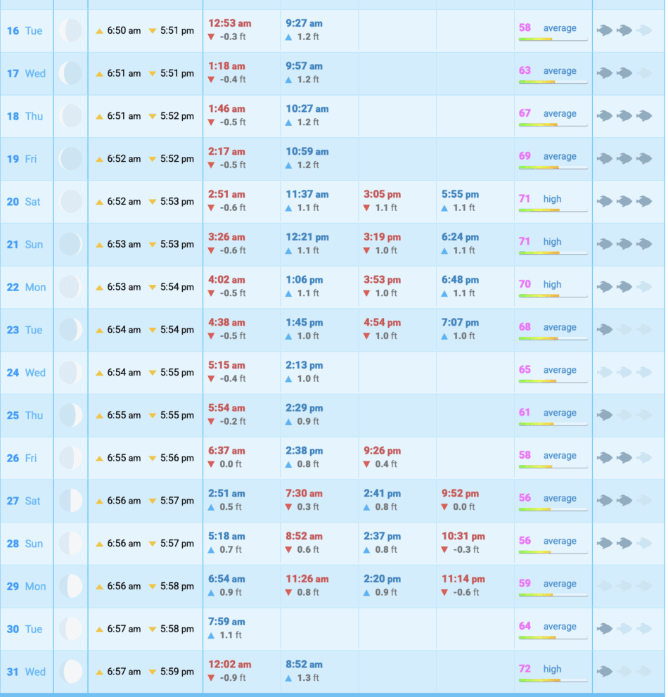 IMPORTANT NOTICEThe times reflected in the tidal table for Grand Cayman are predictions valid as references for sports fishing in areas near the coast of Grand Cayman. THEY ARE NOT SUITABLE FOR NAVIGATION. Remember that to practice any activity at sea like diving, windsurfing and fishing from a boat or underwater fishing should always be consulted with the official tide tables of the port of Grand Cayman.