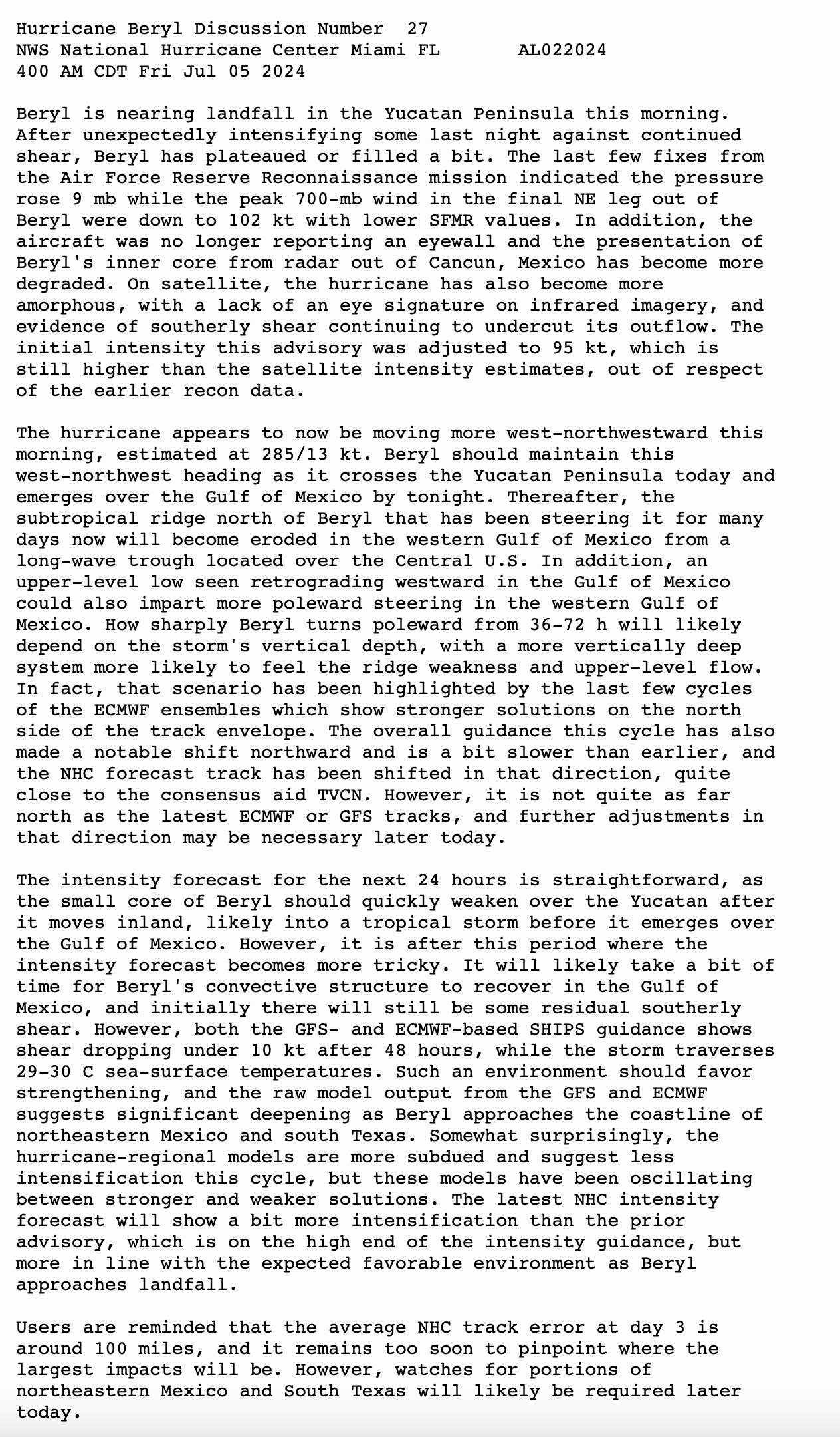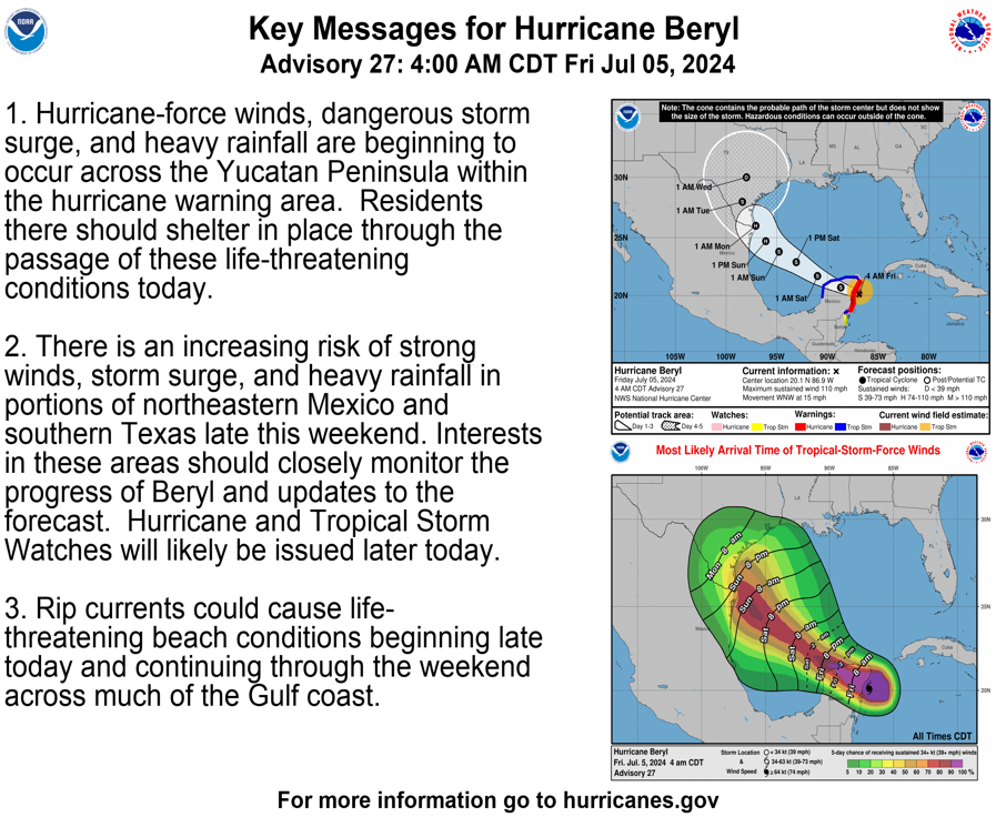CENTER OF BERYL MOVING INLAND OVER THE YUCATAN PENINSULA… …DANGEROUS HURRICANE-FORCE WINDS, STORM SURGE, AND DAMAGING WAVES EXPECTED IN THE LANDFALL AREA THIS MORNING