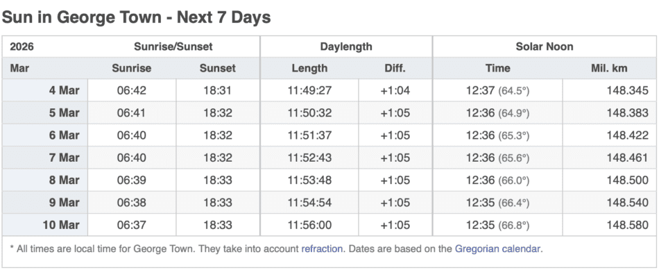 Grand Cayman Sun & Tides Tables March 2026