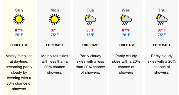 Temperature: Today’s expected temperatures – 75°F to 89°F. Yesterday: H 88.9°F L 71.9°F