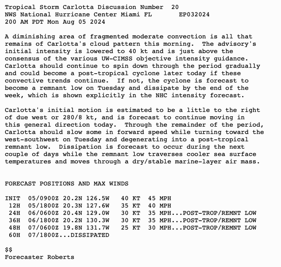 CARLOTTA CONTINUES TO WEAKEN… …COULD BECOME A POST-TROPICAL CYCLONE LATER TODAY