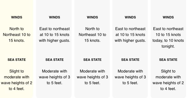 Winds: Today NNE 10-20 mph Tonight: NE 10-20 mph