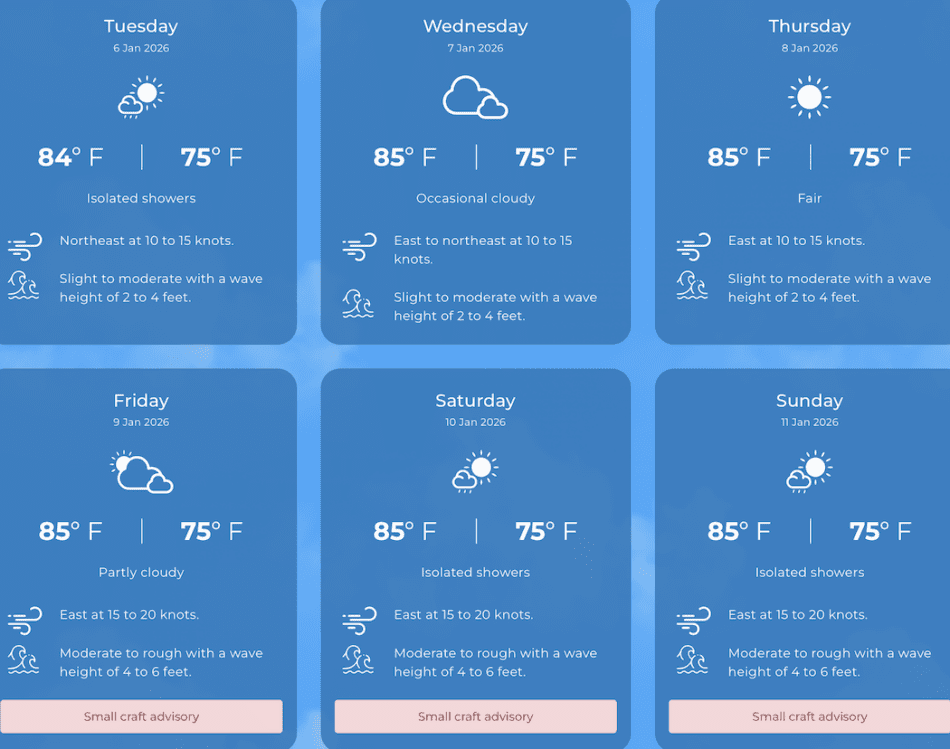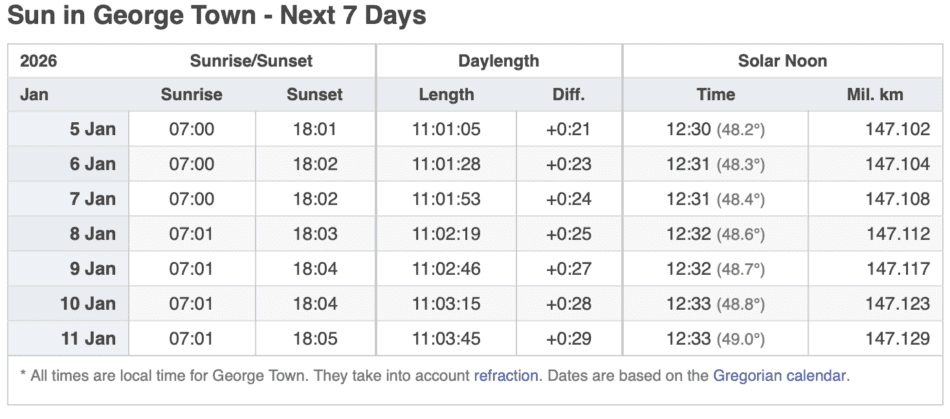 IMPORTANT NOTICEThe times reflected in the tidal table for Grand Cayman are predictions valid as references for sports fishing in areas near the coast of Grand Cayman. THEY ARE NOT SUITABLE FOR NAVIGATION. Remember that to practice any activity at sea like diving, windsurfing and fishing from a boat or underwater fishing should always be consulted with the official tidetables of the port of Grand Cayman.