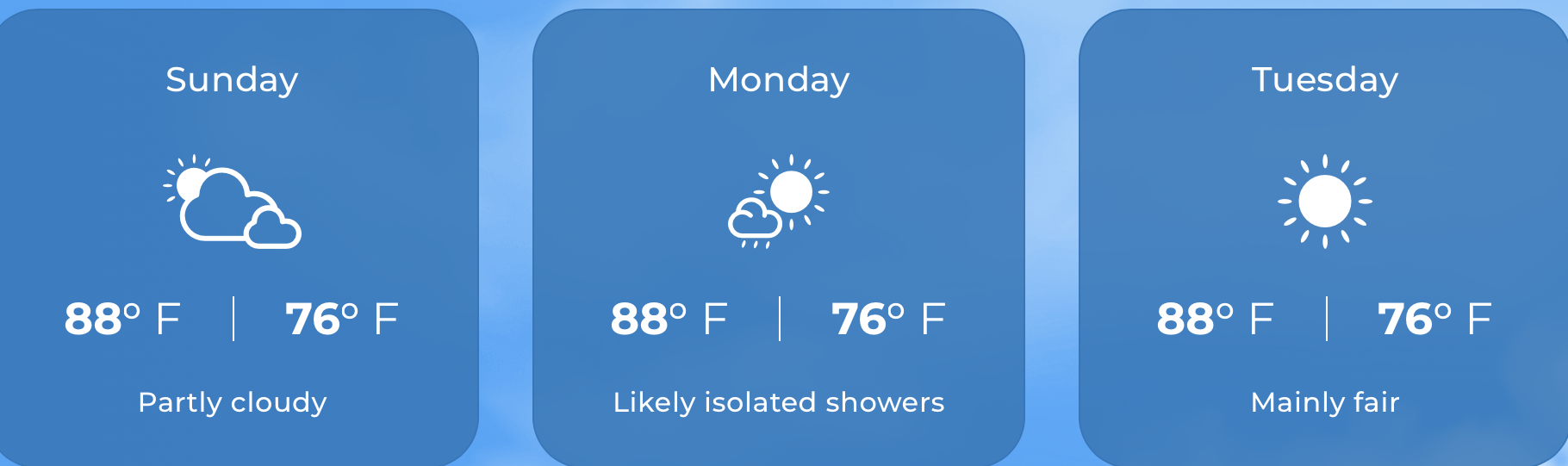 UV: 8.8 VERY HIGH (DOWN from yesterday) Expected temperatures: 75°F to 84°F. Yesterday: H 85.5°F L 69.9°F