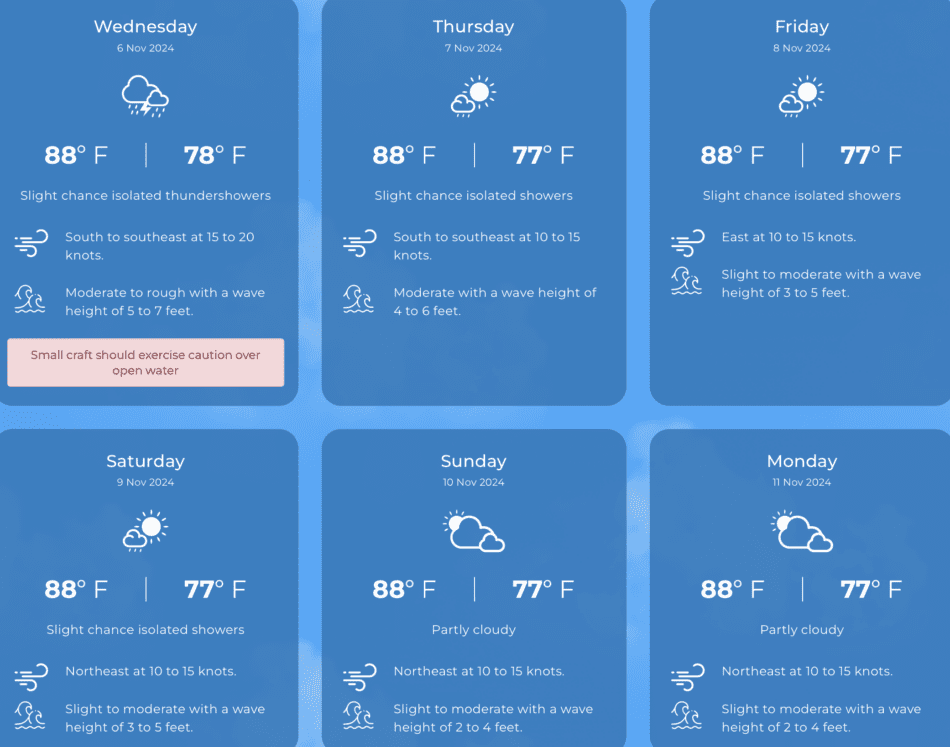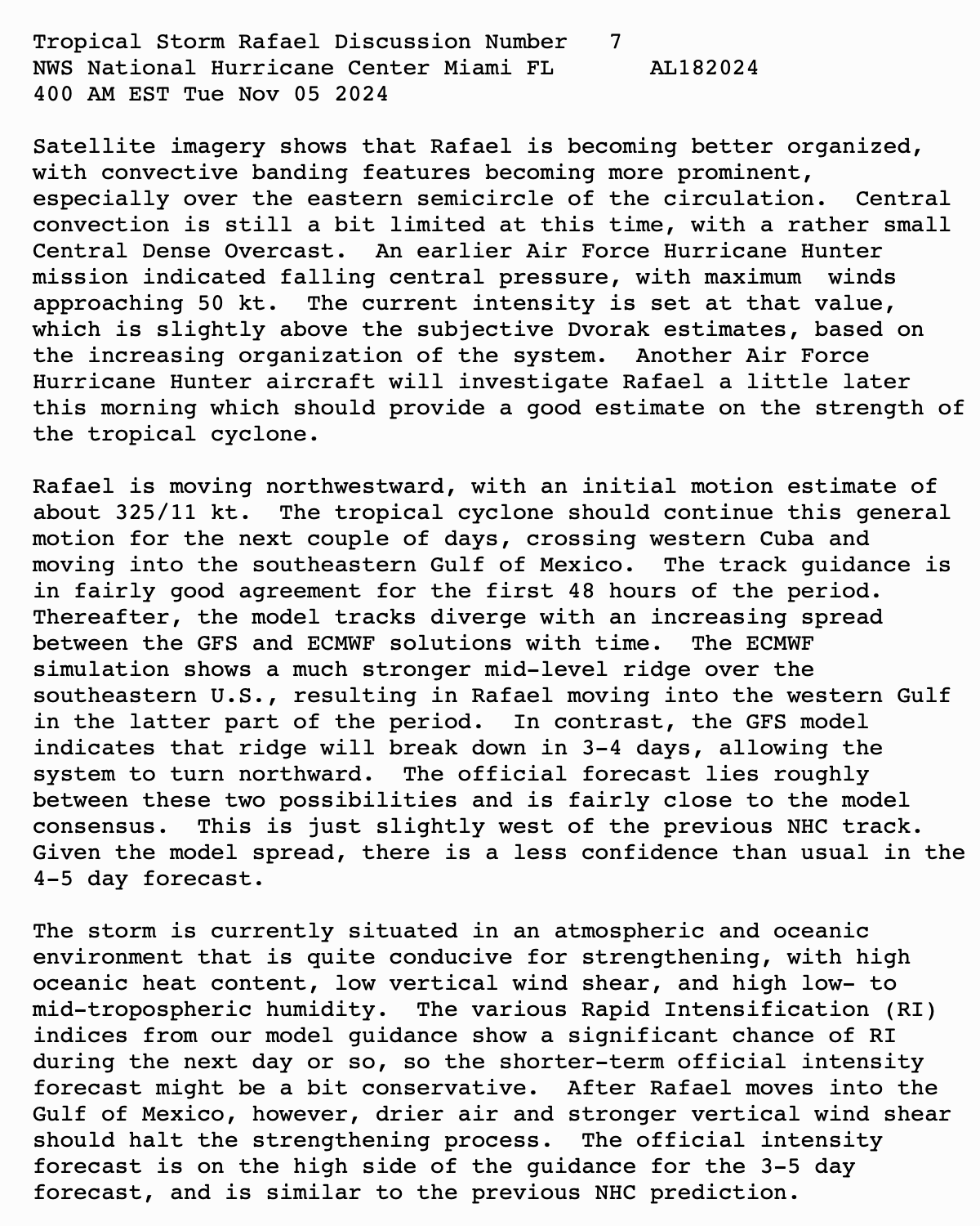 An increase in cloudiness and showers along with strong northerly winds and roughs is expected by Tuesday morning as Tropical Storm Rafael approaches the Cayman area. Hurricane Warning remains in effect for the Cayman Islands
