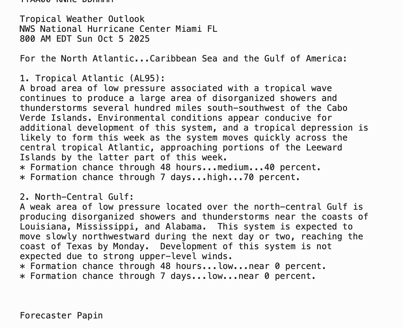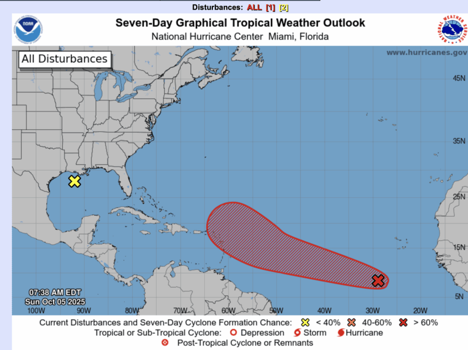 | Tropical Weather Outlook 800 AM EDT Sun 5 Oct 2025 1205 UTC Sun 5 Oct 2025 | |