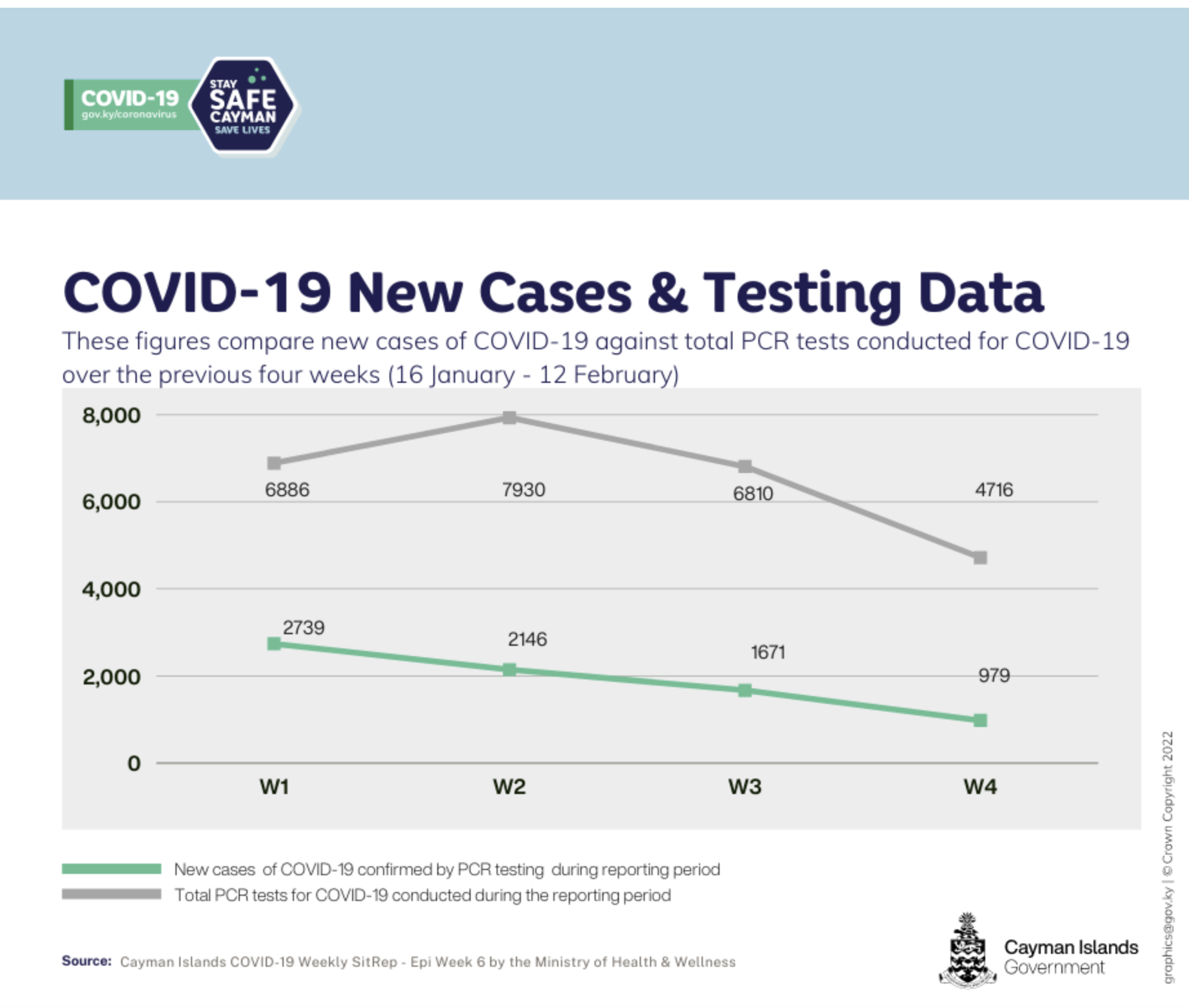 Grand Cayman – The downward trend in new COVID-19 cases continued last week according to the latest situational report released by the Ministry of Health tonight (Wednesday, 16 February).