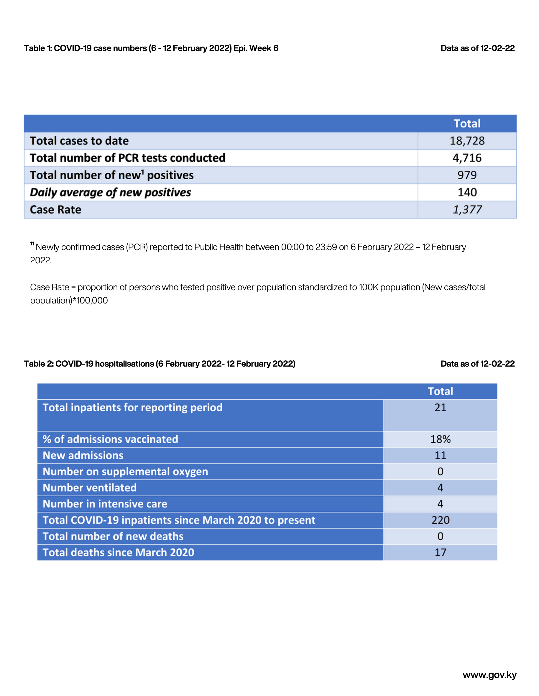 The full situational report can be viewed and downloaded here: https://www.gov.ky/news/press-release-details/weekly-covid-19-trends-report—6-12-february