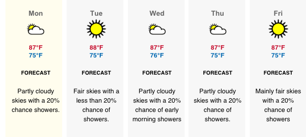 Temperature: Today’s expected temperatures – 76°F to 89°F. Yesterday: H 88.9°F L 74.7°F
