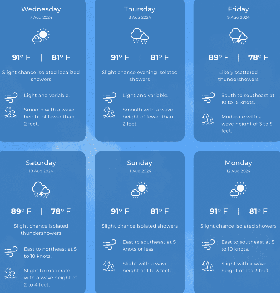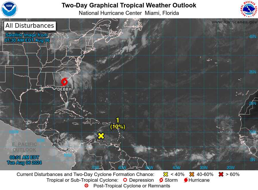 Light and variable winds along with slight seas will continue across the Cayman area for the next 24 hours due to a weak pressure gradient across the Caribbean. The Cayman Islands National Weather Service is monitoring a tropical wave over the Eastern Caribbean which according to the National Hurricane Center has a low chance of development over the next 7 days. The National Hurricane Center continues to issue advisories on Tropical Storm Debby, currently impacting the southeast United States.