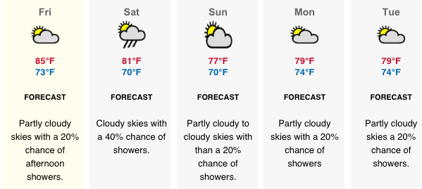 Temperature: Today’s expected temperatures – 74°F to 88°F. Yesterday: H 88.2°F L 76.0°F