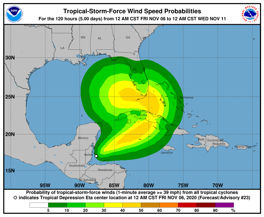 Intermittent showers along with fresh to strong east to southeasterly winds and rough seas are expected across the Cayman area over the next few days as result of the motion Tropical Storm Eta. Radar images show scattered showers in and around the Cayman area which are moving towards the west. The National Hurricane Center in Miami Florida is issuing advisories on Tropical Depression Eta, Which at 1 a.m. was located 17.0 N 87.6 W or about 450 miles west to southwest of Grand Cayman with maximum winds of 35 mph and is moving north northwest at 8 mph.
