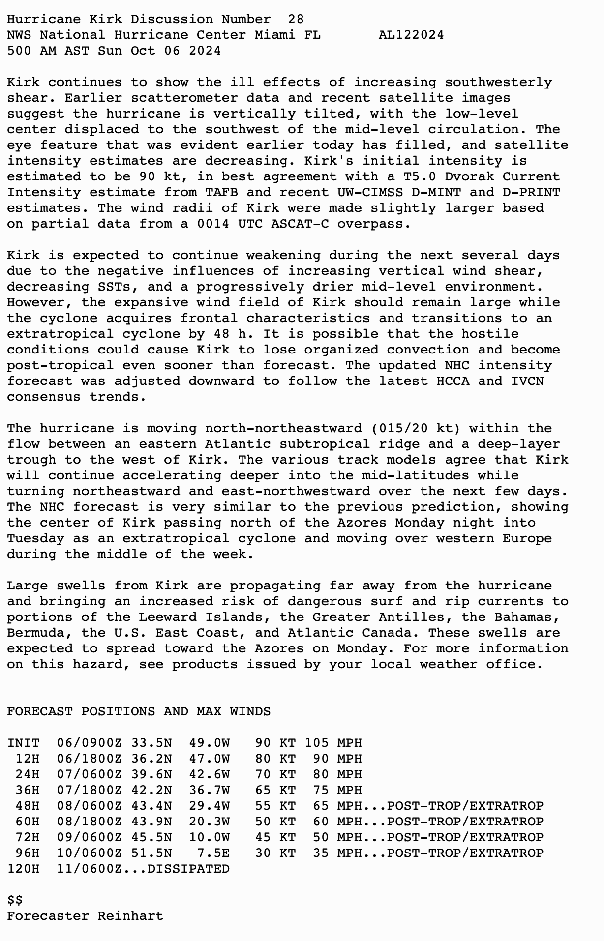 KIRK ACCELERATING NORTH-NORTHEASTWARD OVER OPEN WATERS… …LARGE SWELLS ARE PRODUCING AN INCREASED RISK OF LIFE-THREATENING RIP CURRENTS ALONG THE U.S. EAST COAST